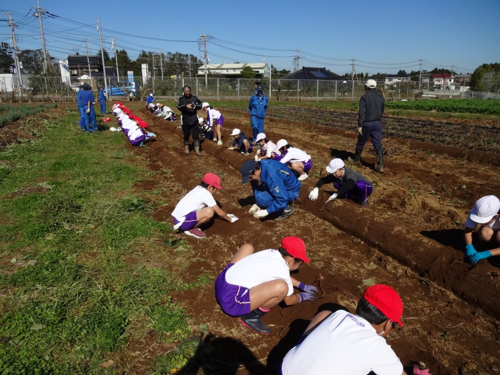 下総みどり学園4年生が来校し、1学期に植えたサツマイモを収穫しました。定植後、園芸科作物選択の2年生が栽培管理を行ってきたものです。今日はいよいよ収穫。本校生徒も積極的にコミュニケーションを取り、協力して実習を進めていました。