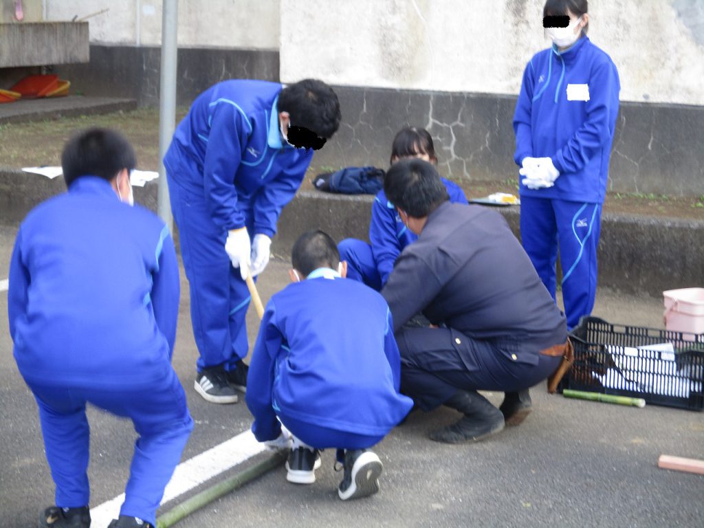 事前に作成した見本の竹垣や竹垣の枠組みを持参し、中学生は、それぞれのグループに分かれての作業を行いました。中学生は、立子にする真竹を各グループで7本程度ノコギリで切り、シュロ縄でその竹をいぼ結びで固定しました。中学生にとっては、竹で垣根を作る初めての経験となりましたが、充実した特別授業ができました。